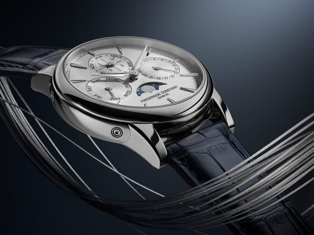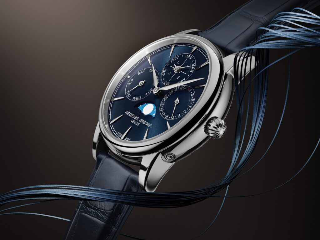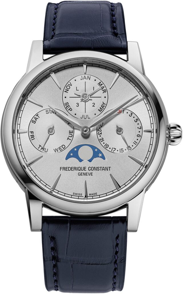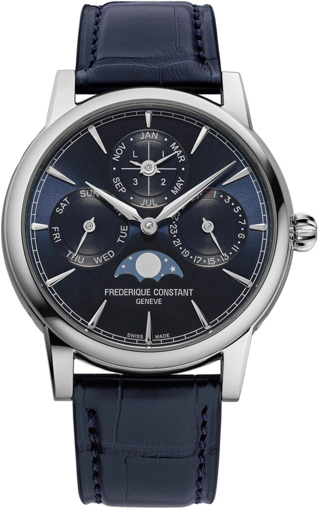 Classic Perpetual Calendar Manufacture to jeden z najsłynniejszych modeli Frederique Constant, niezależnej, rodzinnej firmy z siedzibą w Genewie, założonej w 1988 roku. Mamy tutaj trzy nowe wersje tego modelu: dwie stalowe wersje z niebiesko-srebrnymi tarczami oraz limitowaną edycją z 18-karatowego żółtego złota z czarną onyksową tarczą, limitowaną do zaledwie 37 egzemplarzy. Wszystkie trzy wersje mają 40-milimetrową średnicę koperty, pasek ze skóry aligatora i słynny kaliber FC-776, który uczynił markę pionierem w dziedzinie najtańszych zegarków z wiecznym kalendarzem na świecie.
