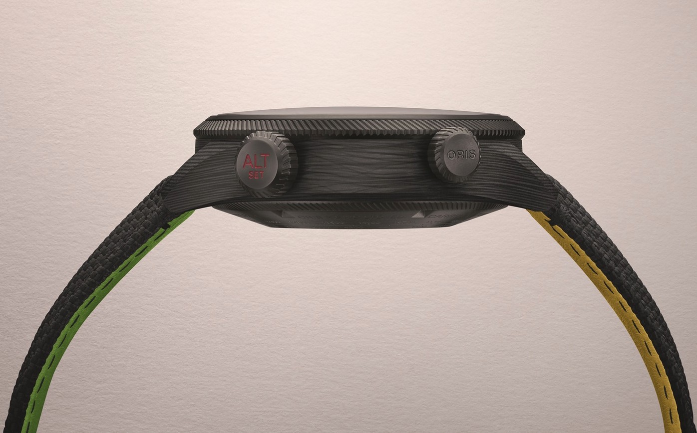 Po co zadowalać się konwencjonalnym rozwiązaniem, skoro istnieją materiały z kosmosu? Oris nawiązał współpracę z 9T Labs, spółką spin-off prestiżowej Politechniki Federalnej w Zurychu, która opracowuje kompozyty dla przemysłu lotniczego, satelitów i implantów medycznych. Jednak nikt przed nimi nie zastosował tej technologii w zegarmistrzostwie. Karbonowa koperta stanowi fascynujący kontrast. Na przykład, w dotyku przypomina plastik, jest mocniejsza od stali i o 70% lżejsza od tytanu. Każdy element ma również unikalną strukturę przypominającą słoje drzew. Żadna inna technologia nie jest w stanie odtworzyć tego efektu wizualnego. Dekiel zegarka wykonany jest z tytanu z powłoką PVD.