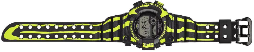 To, co natychmiast rzuca się w oczy, to jaskrawożółte, neonowe pasy, które kontrastują z głęboką czernią obudowy. Aby jeszcze wierniej oddać naturę płaza, pasek oraz pierścień lunety wykonano z biożywicy, którą poddano specjalnemu procesowi natryskiwania. Dzięki temu uzyskano fakturę przypominającą skórę żaby, co nadaje zegarkowi unikalny, niemal organiczny charakter.