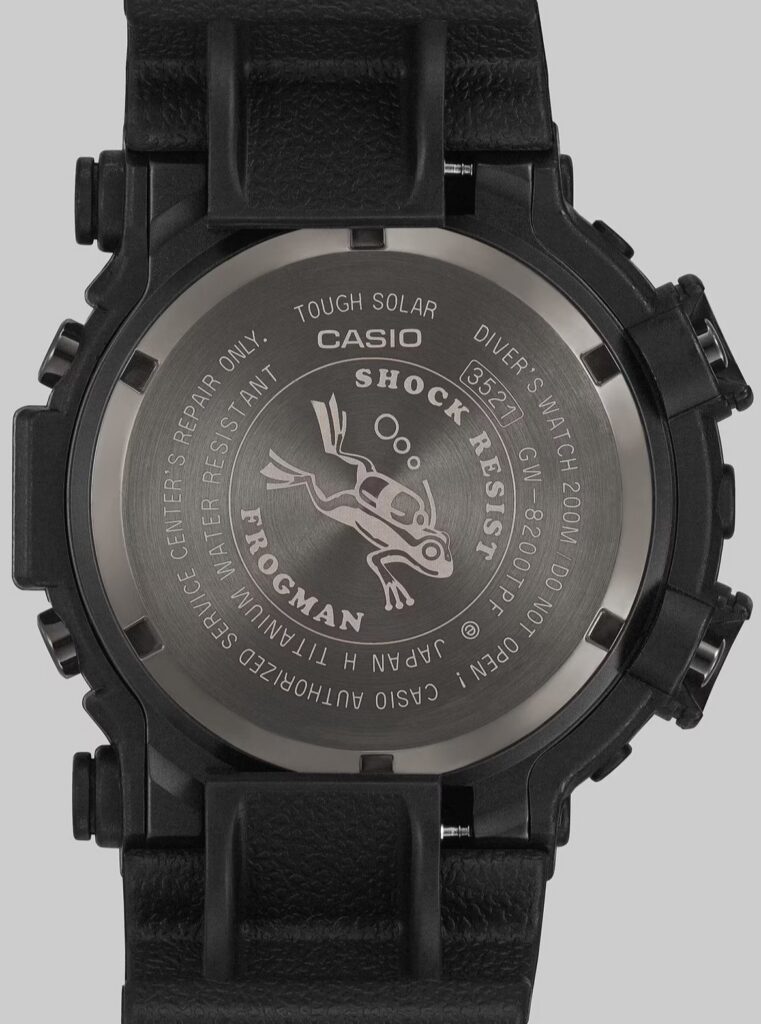 Model ten należy do legendarnej serii Frogman, jedynej w rodzinie G-Shock, która łączy legendarną odporność na wstrząsy z wodoszczelnością do 200 metrów (ISO 6425). Każdy egzemplarz przeszedł rygorystyczne testy na profesjonalnym sprzęcie. Solidna koperta o szerokości 50,3 mm imponuje rozmiarem i doskonale prezentuje się na tęższych męskich nadgarstkach.