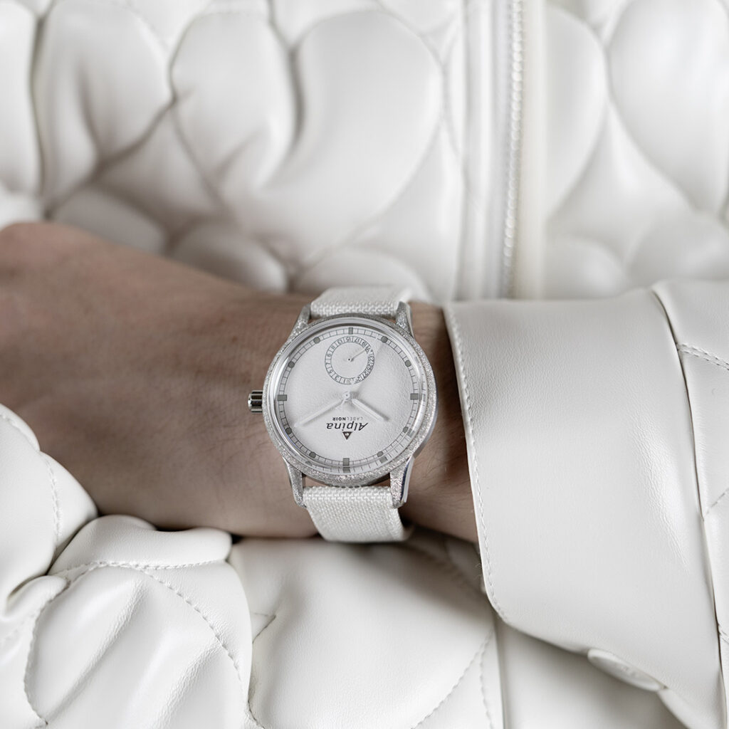 Koperta wykonana ze stali szlachetnej o średnicy 41,5 milimetra przyciąga wzrok dzięki młotkowanej lunecie oraz uszom, które swoją strukturą przywołują na myśl świeżo spadły puch. Wrażenie mroźnego krajobrazu potęguje tarcza o delikatnej, ziarnistej strukturze w odcieniu krystalicznej bieli. Studio Label Noir w pełni wykorzystało potencjał tej współpracy, wprowadzając innowacyjne wykończenia powierzchni koperty, tarczy oraz wskazówek, co przenosi model Alpiner w zupełnie nowy wymiar designu.